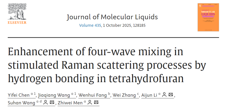 近日,PA捕鱼网官网入口2022级本科生陈奕霏等在门志伟教授的指导下,在氢键调控四氢呋喃(THF)混合溶液受激拉曼散射 (SRS)增强四波混频(FWM)过程取得进展。研究成果以“Enhancement of four-wave mixing in stimulated Raman scattering processes by hydrogen bonding in tetrahydrofuran”为题发表于《Journal of Molecular Liquids》上(DOI: 10.1016/j.molliq.2025.128185)。