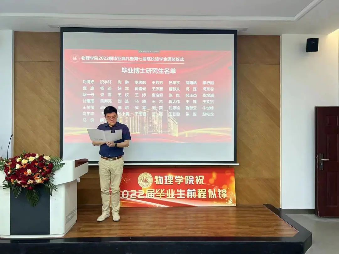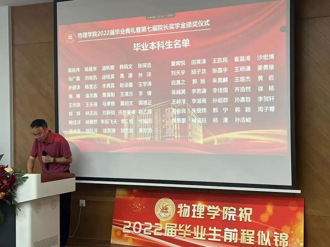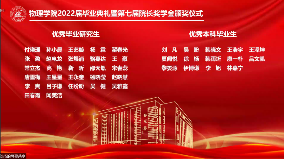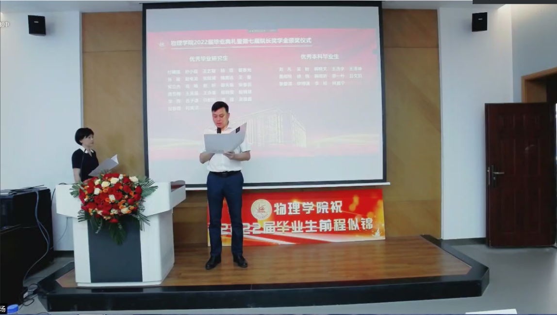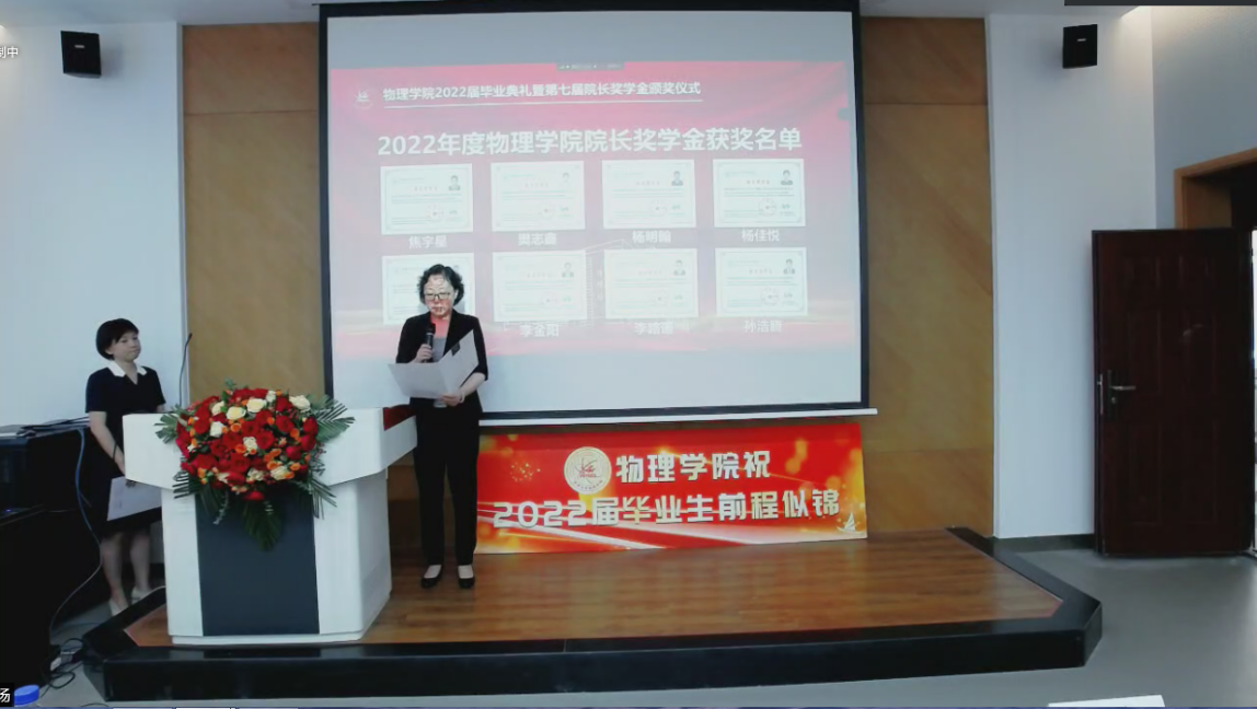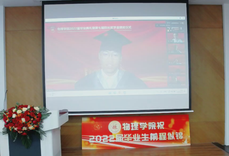 2022年6月19日上午9:00,PA捕鱼网官网入口2022届毕业典礼暨第七届院长奖学金颁奖仪式隆重举行。PA捕鱼网官网入口党委书记孟文卓、PA捕鱼网官网入口院长邹勃、PA捕鱼网官网入口党委副书记唐宗明、PA捕鱼网官网入口副院长王海军、PA捕鱼网官网入口副院长杜菲、PA捕鱼网官网入口副院长杨景于物理楼参加典礼,各系主任、教师代表及全体毕业生于云端参加典礼。典礼由学院党委副书记兼副院长杨讴菡主持。