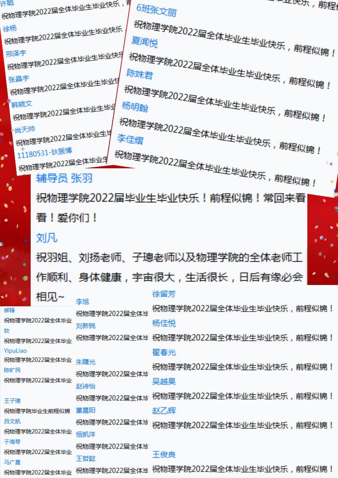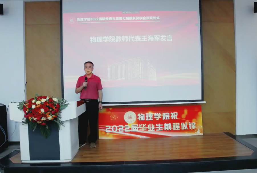 教师代表王海军老师向全体毕业生送上了美好的祝贺与期望。在他看来,人不能离开集体,在学习生活中要明白“利他”的重要性。他用亲身经历教诲同学们,一个人或许很难,但在群体中很多问题都会迎刃而解,PA捕鱼网官网入口如今辉煌的成就是一代代吉大物理人以坚韧不拔、追求卓越的精神几十年如一日奋斗得来的,希望在同学们共同努力下,让物理学科更好、更强。