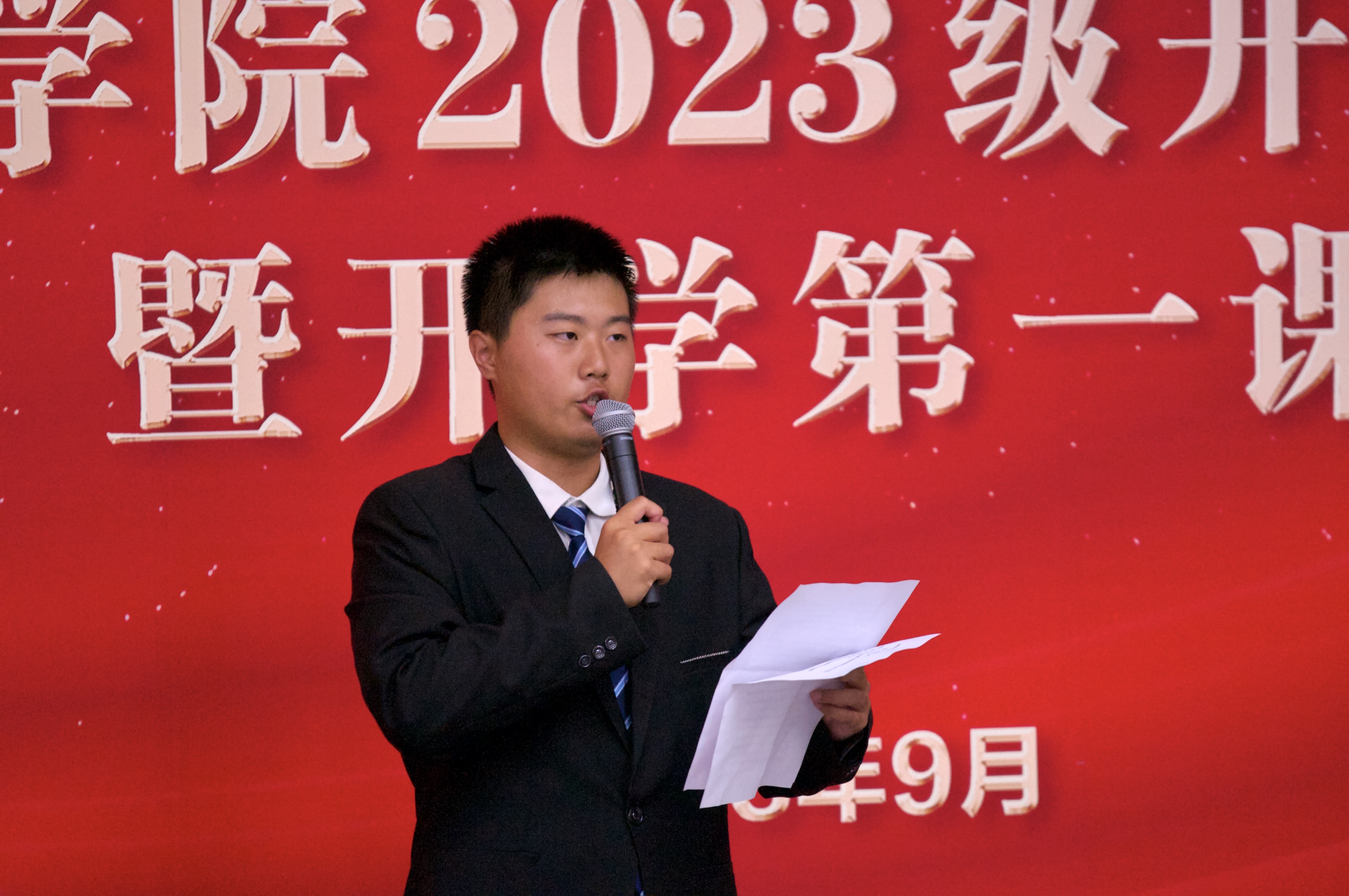 傅元浓同学作为新生代表进行了发言。他首先表达了入学之初在学院感受到的深情厚谊,代表新生对学院迎新工作表达感谢;之后从自身角度展望了对大学生活的憧憬,探讨物理学科在国家发展建设中的重要作用,并号召全体23级新同学珍惜大学时光,增长报效祖国的才干,争做一名合格的建设者。