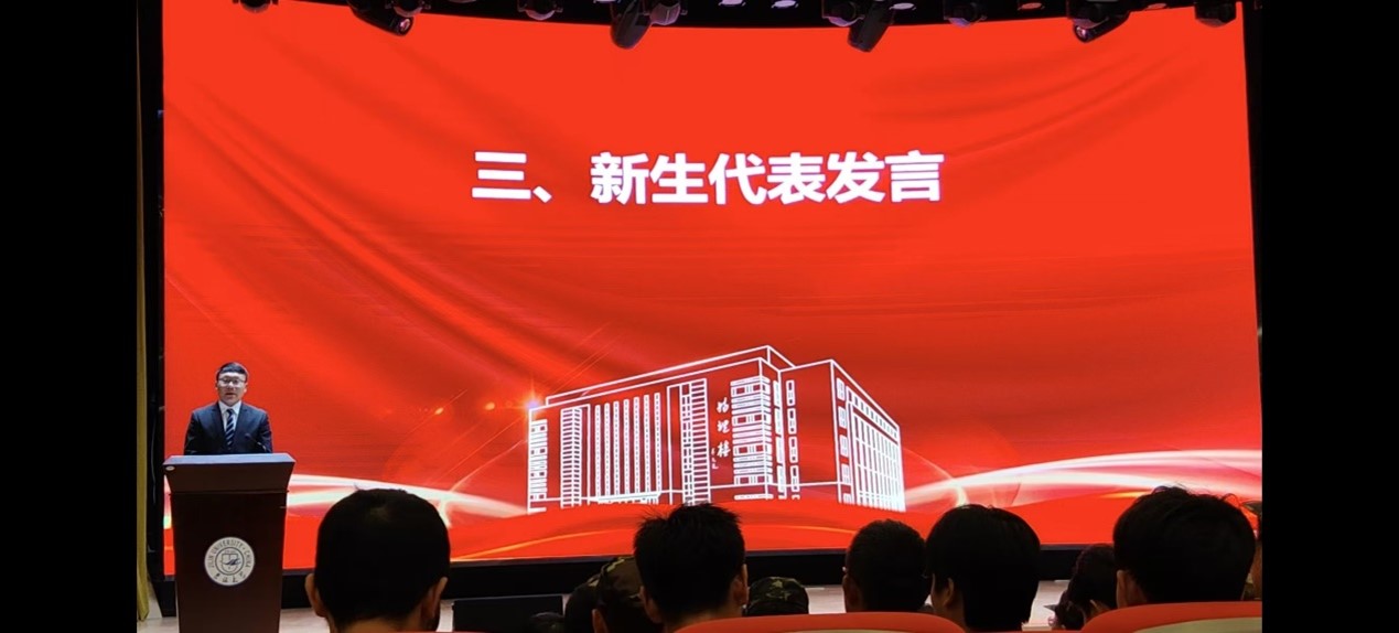 李欣武同学作为新生代表进行了发言。他首先代表新生表达了入学以来对学院老师和学长学姐热情接待的感谢;之后从自身角度展望了对大学生活的憧憬,探讨物理学科在国家发展建设中的重要作用,并号召全体新同学珍惜大学时光,增长报效祖国的才干,争做一名合格的建设者。
