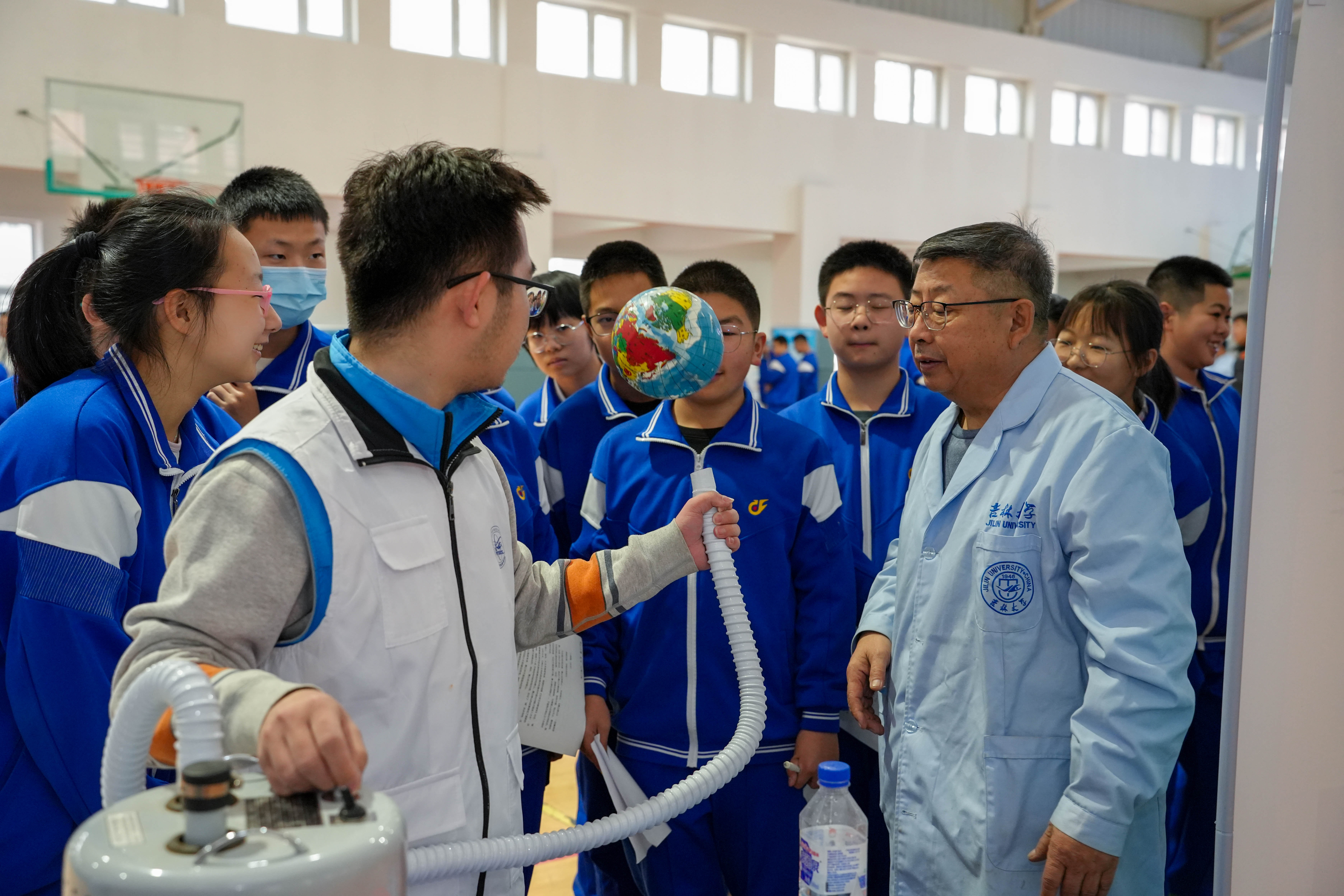 现场筹备环节,PA捕鱼网官网入口关心下一代工作委员会成员、PA捕鱼网官网入口退休教师梁浩教授带领学院师生带着各种科学小实验走到中学生身边。首先梁老师为参加活动的志愿者讲解了各实验的原理和操作流程,过程中,同学们认真学习记录,在实践中感受物理的魅力,也在梁浩老师的影响下近距离感受到了吉大物理深厚的历史和吉大物理人的魅力。